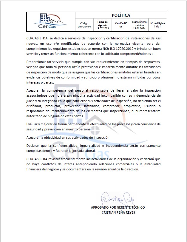 Cergas Ltda. Se dedica a servicios de Inspección y Certificación de instalaciones de gas nuevas, en uso y/o modificadas de acuerdo a la normativa vigente y cumple con los requisitos establecidos en norma NCH-ISO 17020:2012.