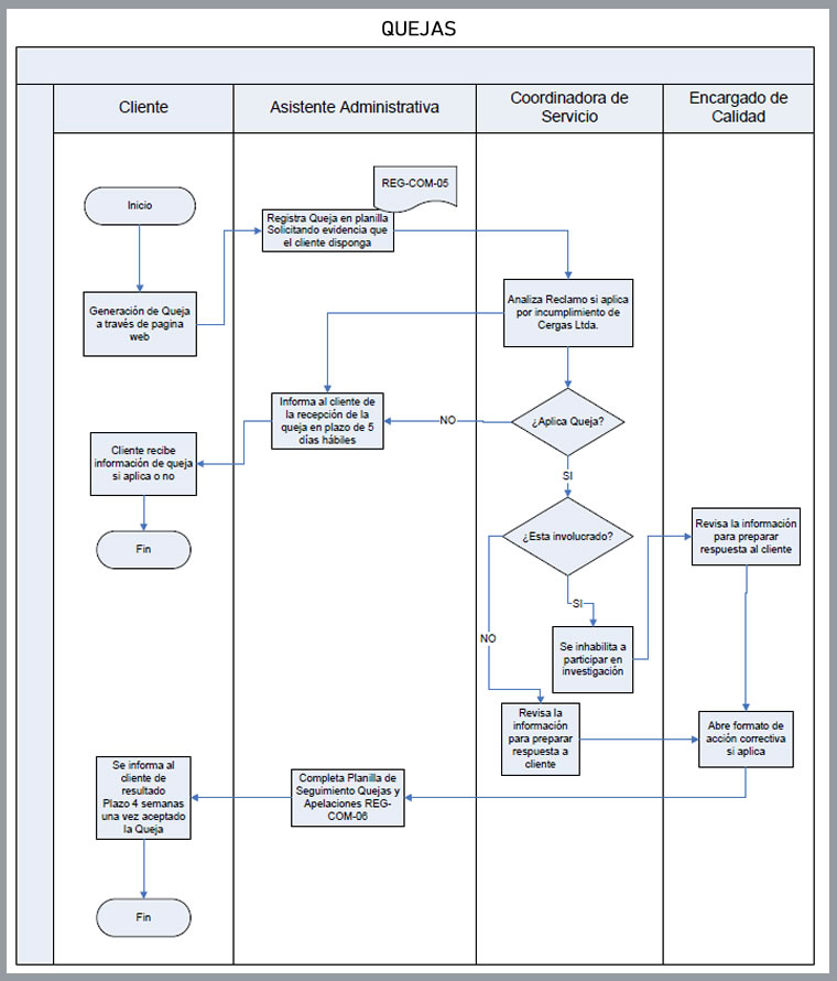 Cergas Ltda. en su visión de mejora contínua considera que las quejas y apelaciones recibidas de clientes u otras partes son una oportunidad para la mejora del servicio, por lo que ellos serán siempre direccionados hacia la Gerencia General quien dará respuesta oportuna y formal.